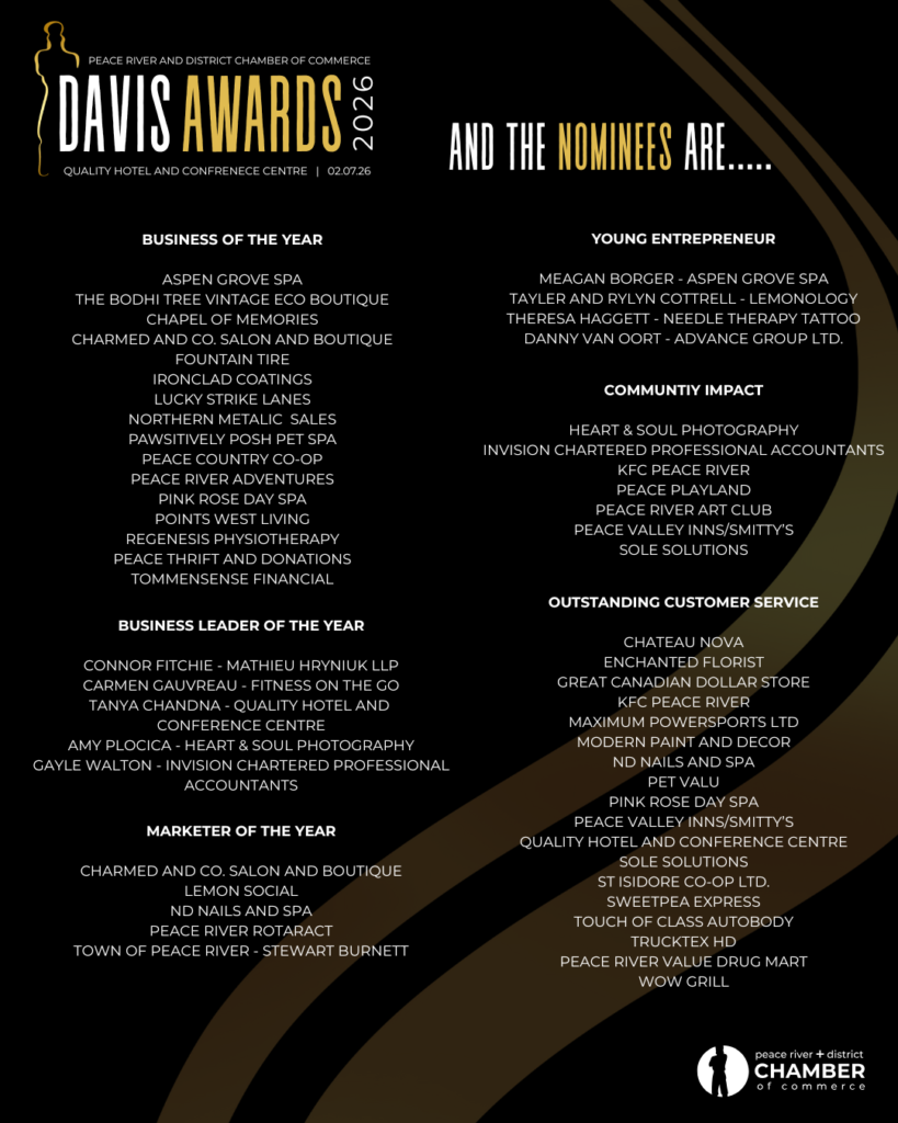 The Annual Peace River and District Chamber of Commerce Davis Awards is a valuable opportunity to recognize and celebrate all our hardworking local businesses, organizations and individuals who give so generously to our community and provide services we dearly love and need. Help us shine a light on local businesses, organizations & individuals that have shown exceptional business practices, leadership, and community mindedness by nominating them!
